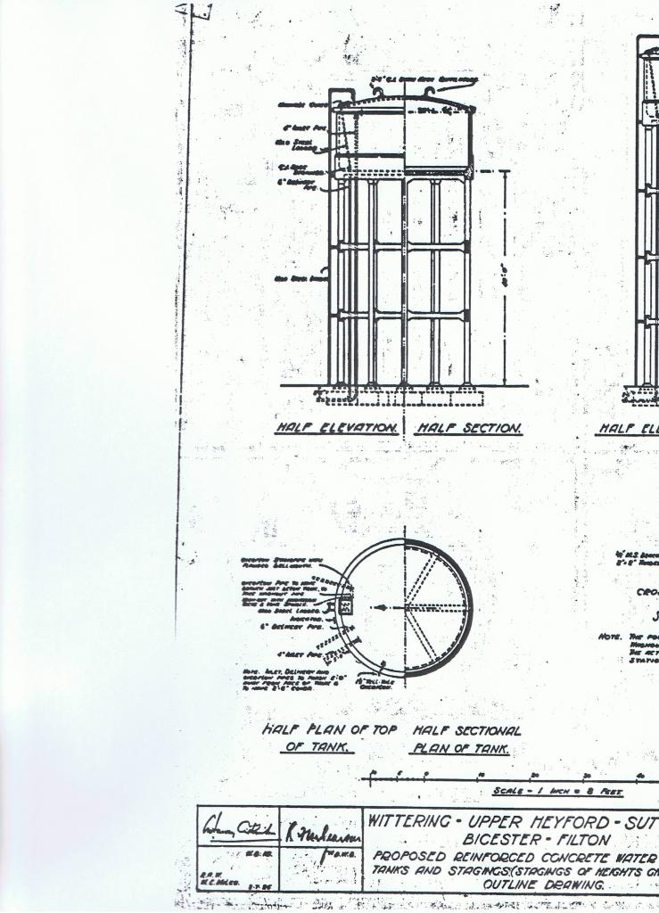 The interesting thing about the water tower is that it does not appear on the site plan but it is listed on the reference schedule (bldg 38). It is cearly shown on a couple of photos so it should be easy enough to interpolate a location for a simulation. The matter of the legs is a strange one. As Ref commented above Dwg 1178/25 shows 40' legs in a hexagonal arrangement wheras the photos show 4 legs in a square.